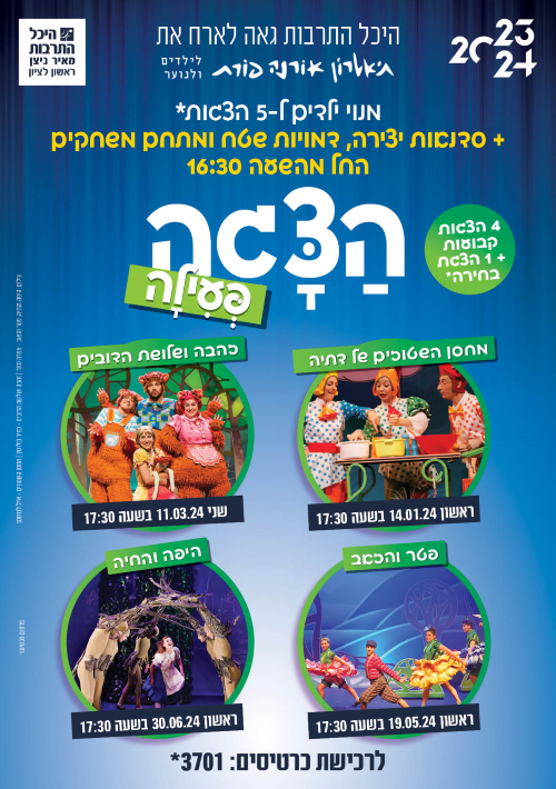 רפרטואר מובחר ומשובח של הצגות ילדים איכותיות המלוות בפעילות חווייתית בעונה נוספת ובלעדית להיכל התרבות ראשון לציון