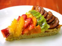4. מזלפים לקלתית קרם פטיסייר כמעט עד גובה הדפנות. חותכים פירות לפרוסות דקות ומניחים