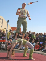 בשעה 18:00 – "מוקפץ" - פרודיה קומית רומנטית אודות זוג ליצנים: היא שתלטנית ומסודרת, הוא רומנטיקן ומבולגן. המופע משלב בדרך הומוריסטית אקרובלנס, אש, להטוטים וטנגו.