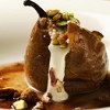 יוצקים כף רוטב על כל אגס. מפזרים פיסטוקים ואגוזי פקאן מזליפים 4 טיפות בלסמי ומגישים.
