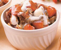 מוציאים את הבטטות מן התנור ומכסים אותן בתערובת. מפזרים מעל הכול מעט מרשמלו ומחזירים לתנור למשך 7-10 דקות או עד שהבטטות רכות והמרשמלו מעט חום.